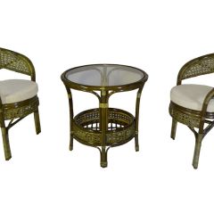 Комплект мебели Пеланги 02/15 включает в себя: 2 кресла и столик с красивым плетением снизу и полочкой, съемные подушки из материала улучшенного качества.